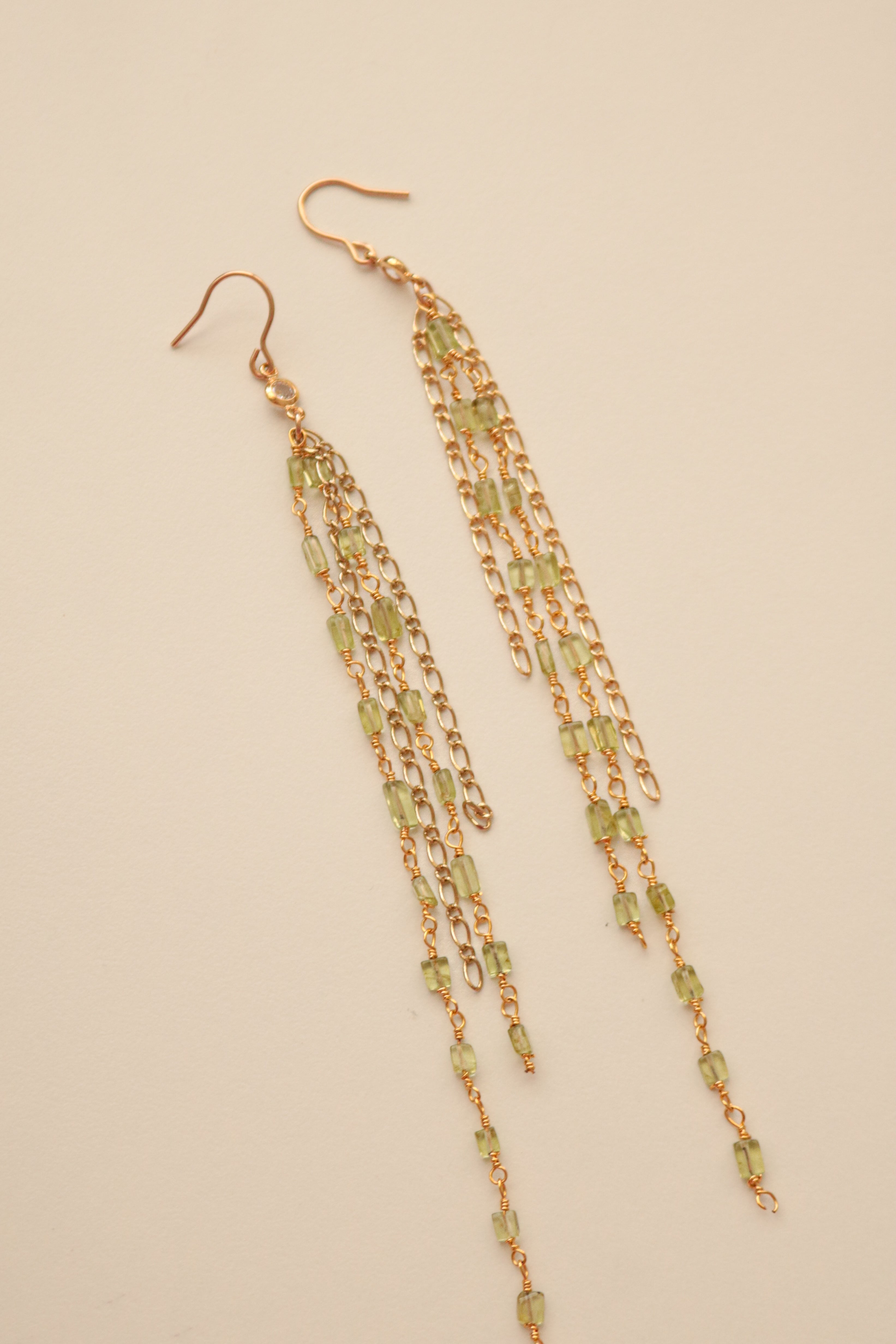 14k gold-filled hook earrings featuring CZ accents and tassel chains made of green tourmaline and 14k gold filled chains.