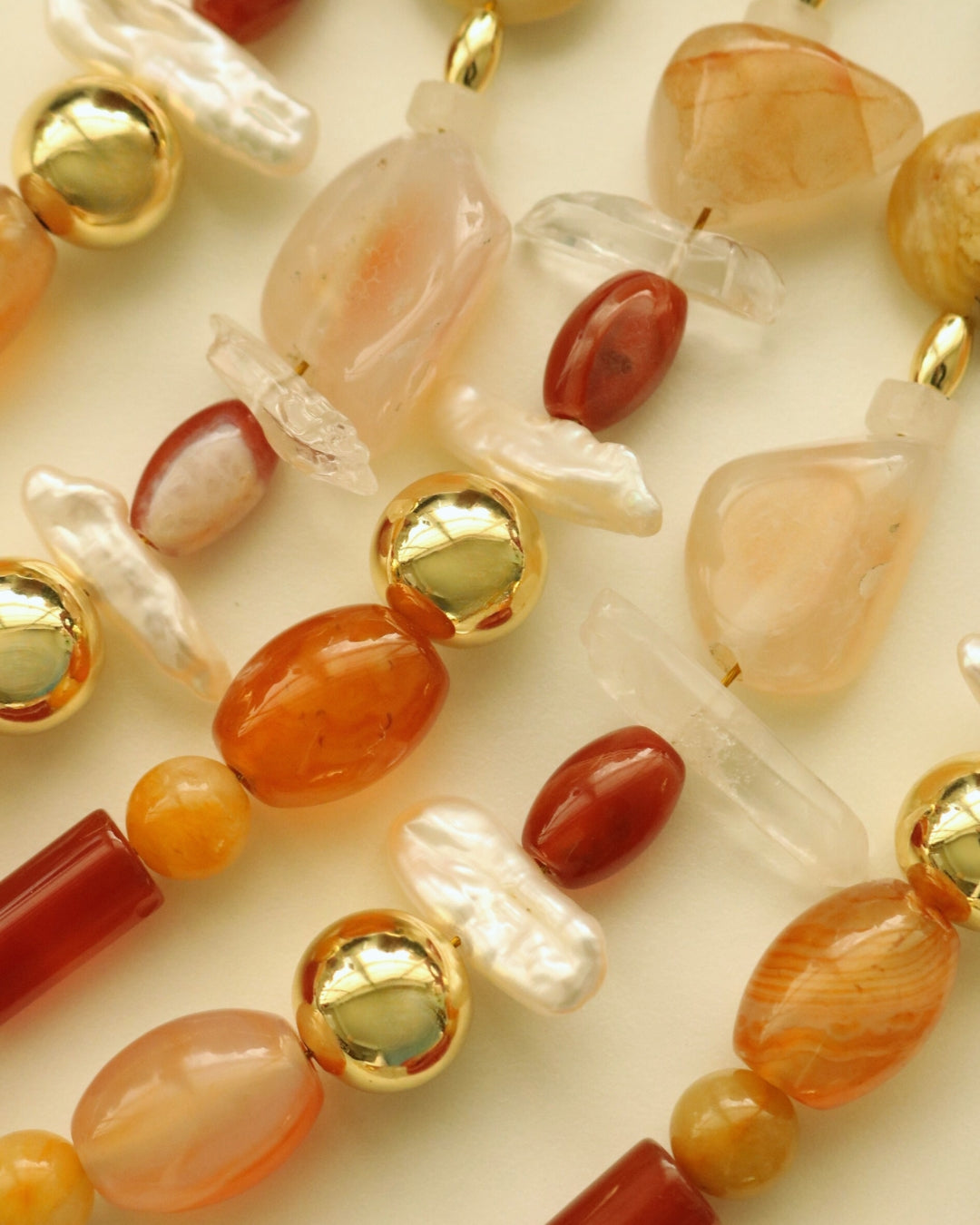 The Devaneio Bracelet features a natural arrangement of Carnelian, Citrine, Agate, Smoky Quartz, Multi-Rutilated Quartz, Clear Quartz, Ocean Jasper, Peach and Orange Moonstone, Amber, Orange Garnet, Jade, and Freshwater Pearls.