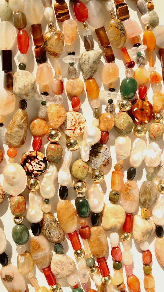 The Devaneio Necklace features a natural arrangement of Carnelian, Citrine, Agate, Smoky Quartz, Multi-Rutilated Quartz, Clear Quartz, Ocean Jasper, Peach and Orange Moonstone, Amber, Orange Garnet, Jade, and Freshwater Pearls.