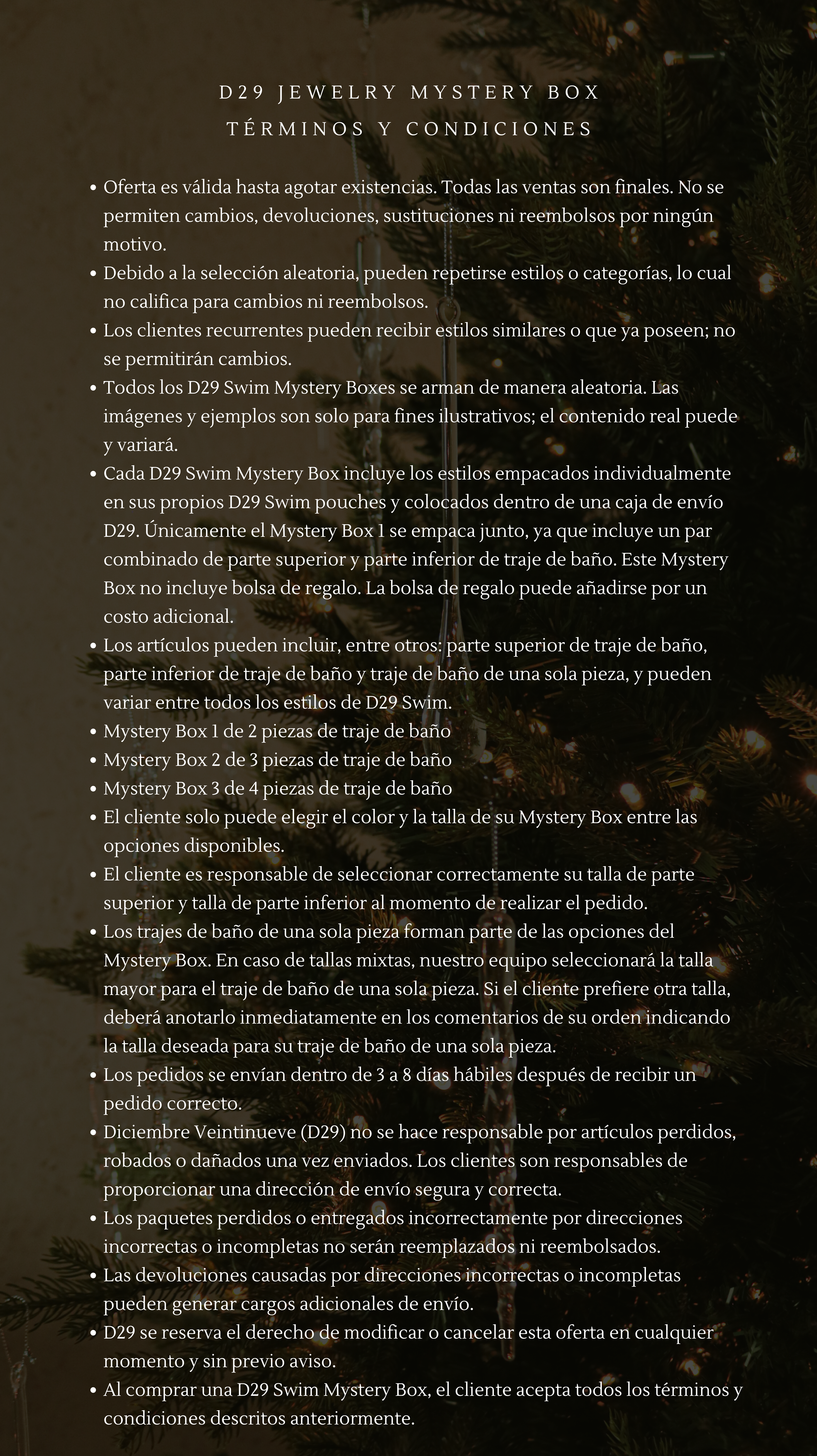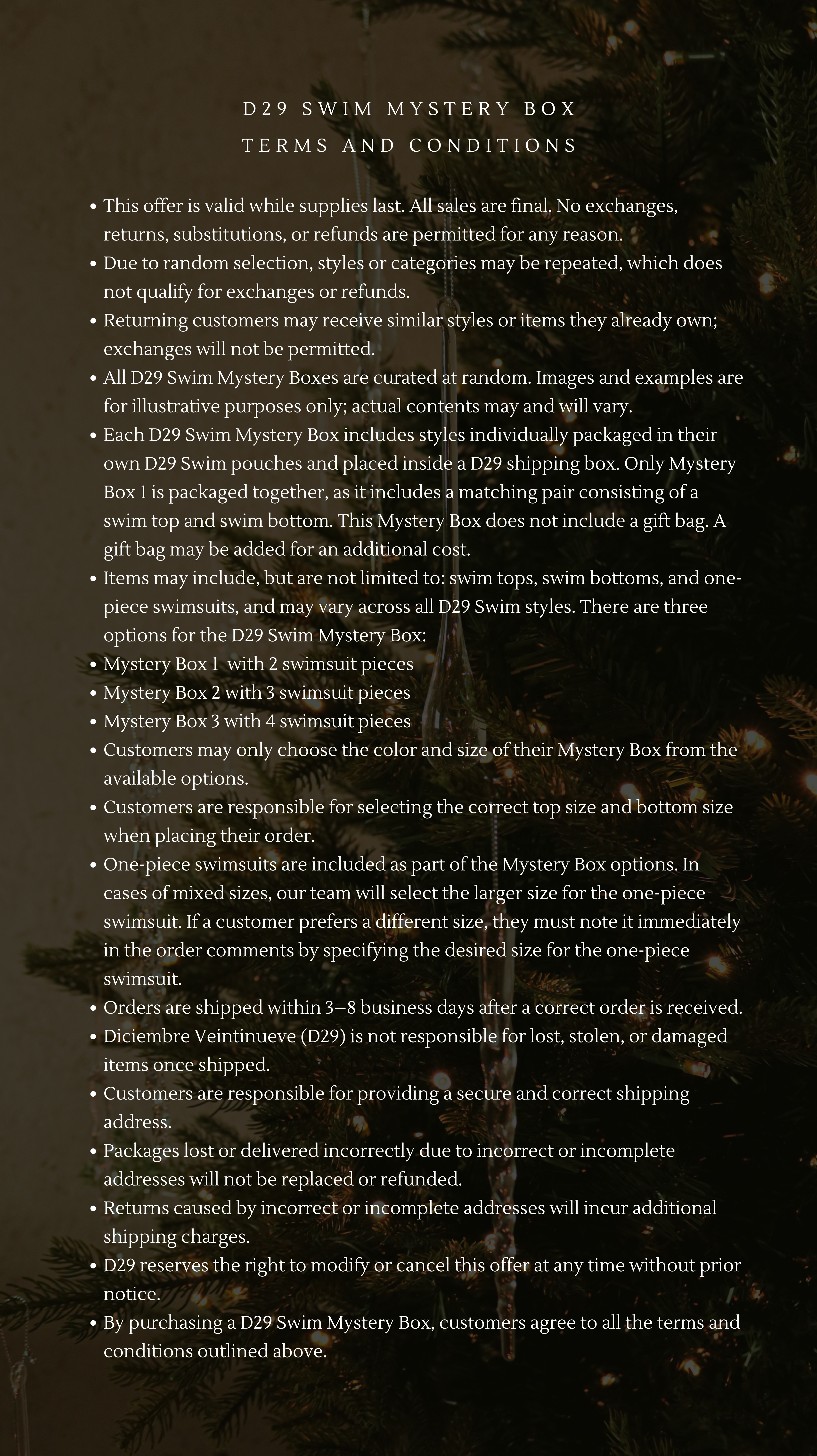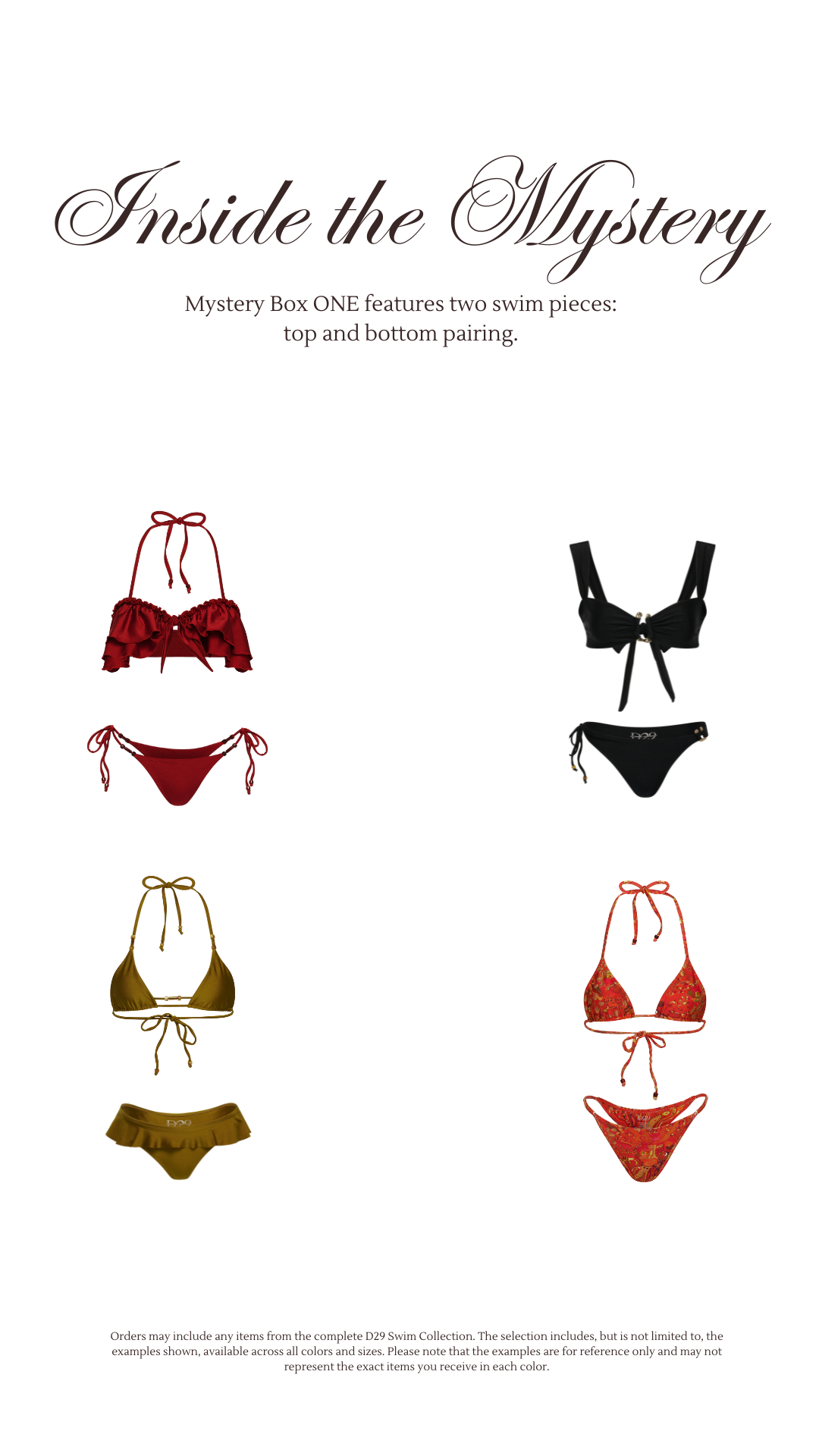 Discover the perfect gift with our Swim Mystery Box 1! Choose your size, preferred color, and Mystery Box option to receive 2 secret D29 Swim styles, handpicked by our team. This Box (swim set) is packaged in (1) iconic swim mesh bag.