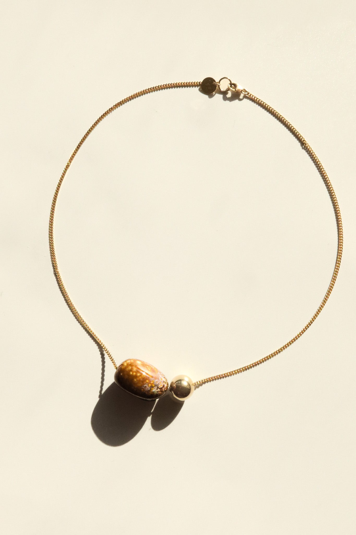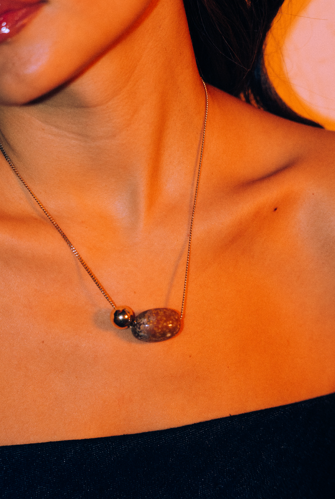 The Rincón Necklace is crafted with an authentic Ocean Jasper and a smooth gold sphere, united by a 24k gold-plated chain. Named after the tranquil beaches of Rincón, Puerto Rico, this design is inspired by the freedom that comes from allowing oneself to release control. This sentiment is reflected in the design of the piece, as the two elements are not fixed permanently, but move with comfort and ease. It serves as a gentle reminder that peace is not found by holding tighter, but by trusting the flow.